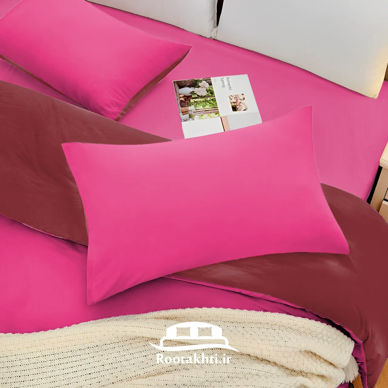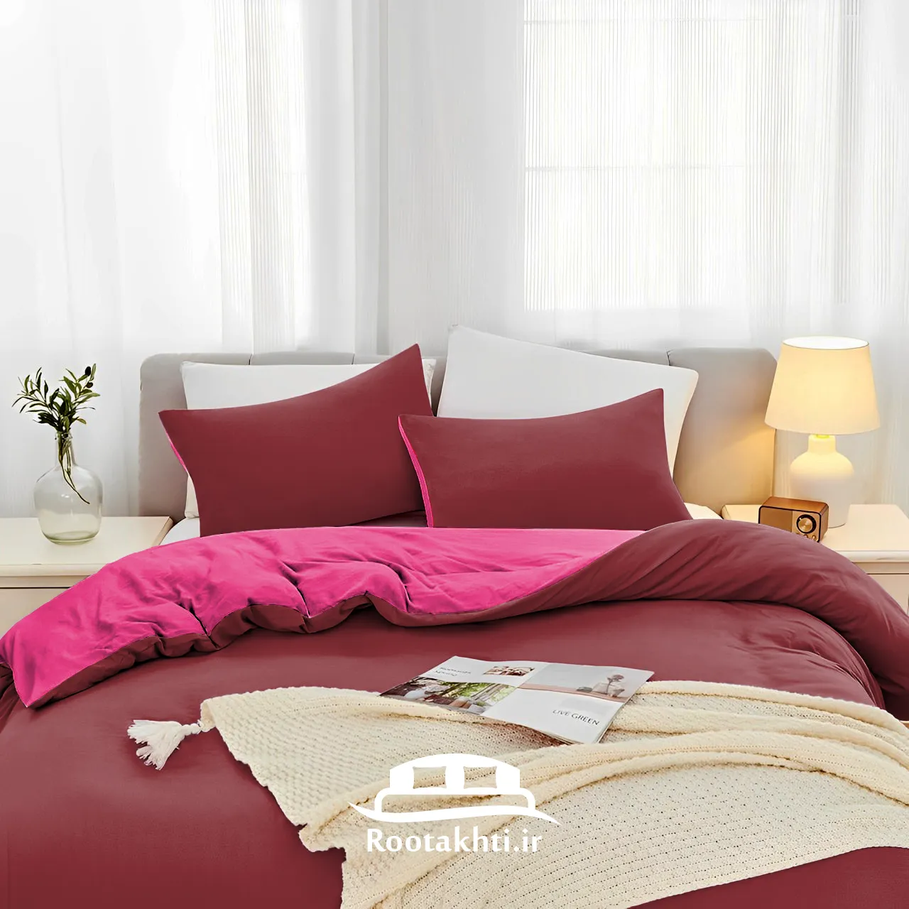 سرویس روتختی دورنگ صورتی رز و زرشکی ترکیبی از لطافت و عمق احساس است که فضایی شیک، گرم و دلنشین به اتاق خواب می‌بخشد. صورتی رز با حس ملایم و عاشقانه خود، فضایی نرم و آرام ایجاد می‌کند و زرشکی با عمق و وقار خاصش، جلوه‌ای لوکس و پرانرژی به فضا می‌آورد.