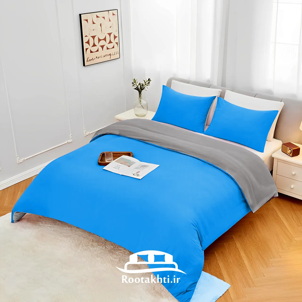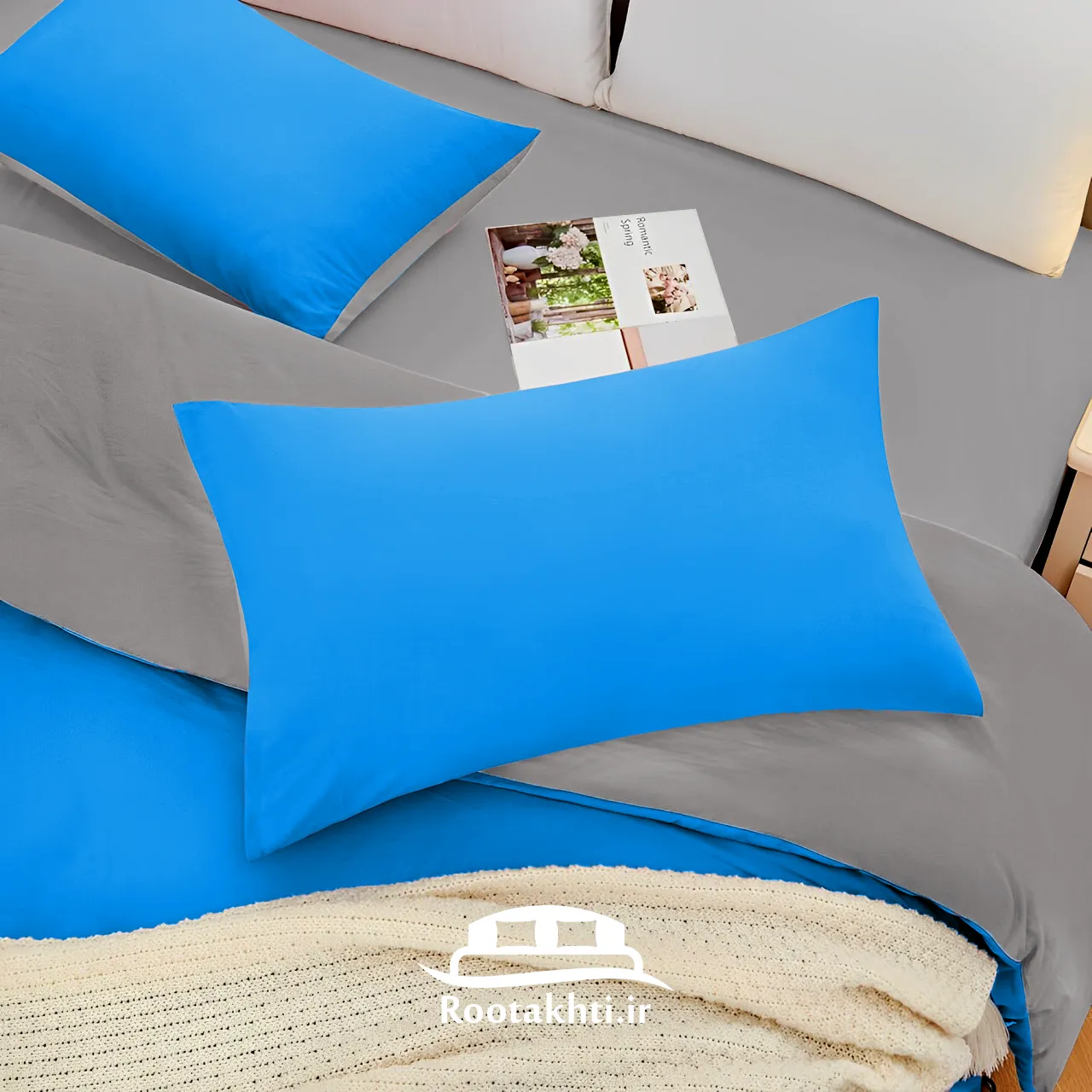 سرویس روتختی دورنگ آبی روشن و طوسی الهام‌گرفته از آرامش آسمان و سکون صبحگاهی است؛ ترکیبی ملایم که فضایی خنک، دنج و متعادل به اتاق خواب می‌بخشد. آبی روشن با حس پاکی و آرامش خود، ذهن را آرام می‌کند و فضایی مناسب برای استراحتی عمیق و خوابی آسوده فراهم می‌آورد.
