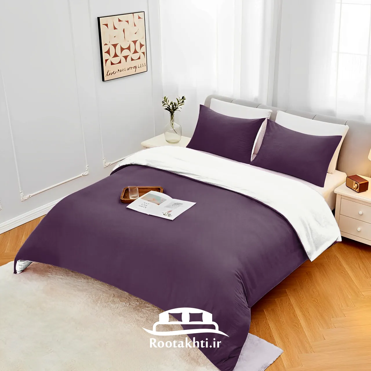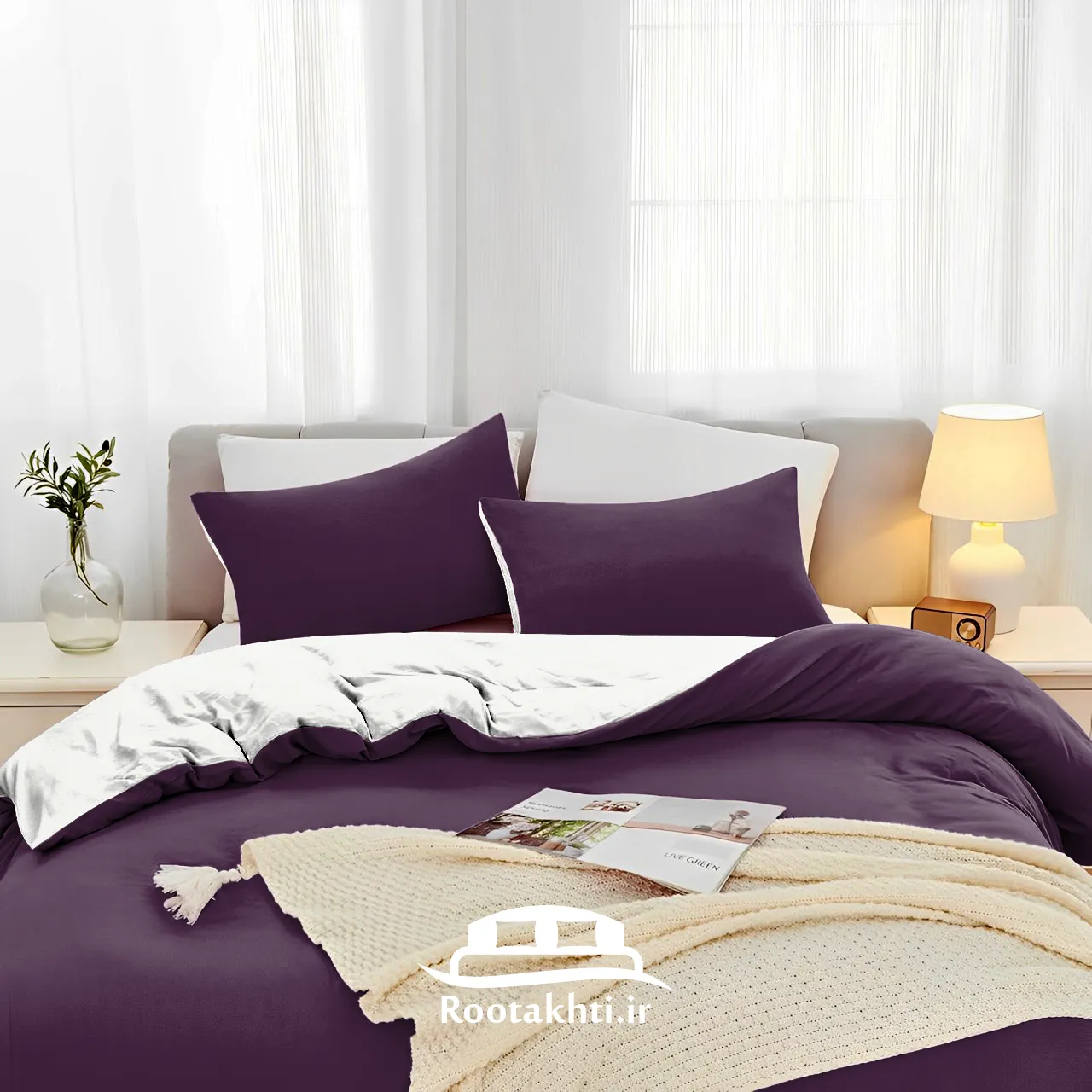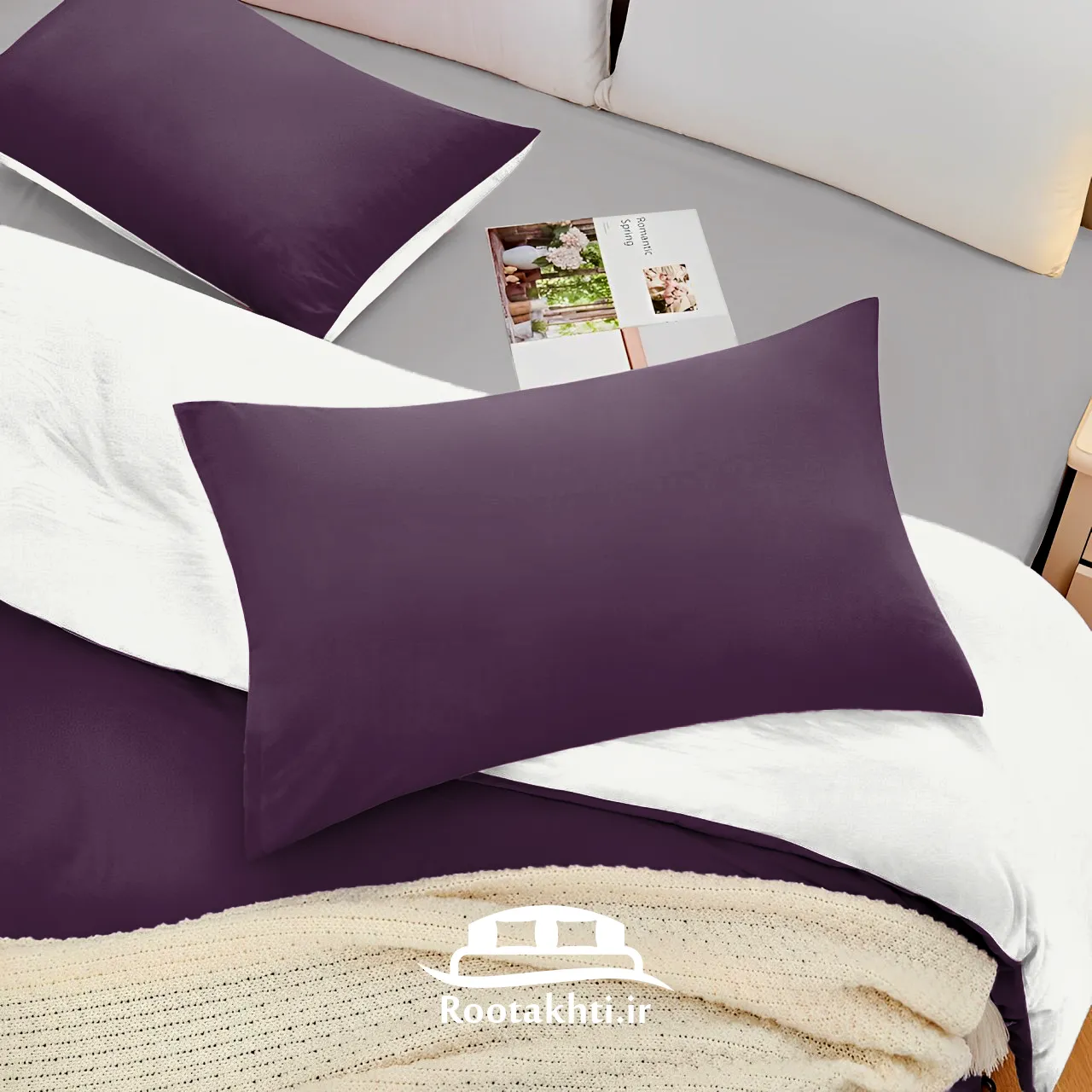 سرویس روتختی دورنگ بنفش بادمجانی و سفید صدفی ترکیبی از عمق و خلوص است که فضایی شیک، آرام و دلنشین به اتاق خواب می‌بخشد. بنفش بادمجانی با عمق و وقار خود، حس شکوه و آرامش را به فضا منتقل می‌کند و سفید صدفی با روشنایی و لطافتش، فضا را روشن، دلپذیر و نرم می‌کند.