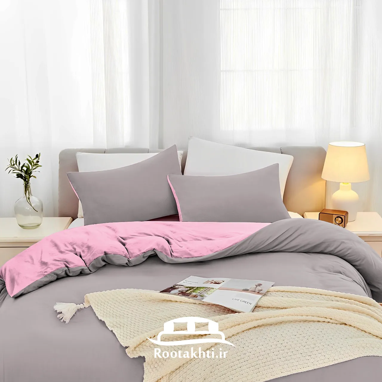 سرویس روتختی دورنگ صورتی رز و طوسی ترکیبی از لطافت و آرامش است که فضایی دنج، شیک و دلنشین به اتاق خواب می‌بخشد. صورتی رز با حس ملایم و عاشقانه خود، فضایی گرم و نرم ایجاد می‌کند و طوسی با آرامش و وقار ملایم خود، تعادل و زیبایی خاصی به فضا می‌بخشد.