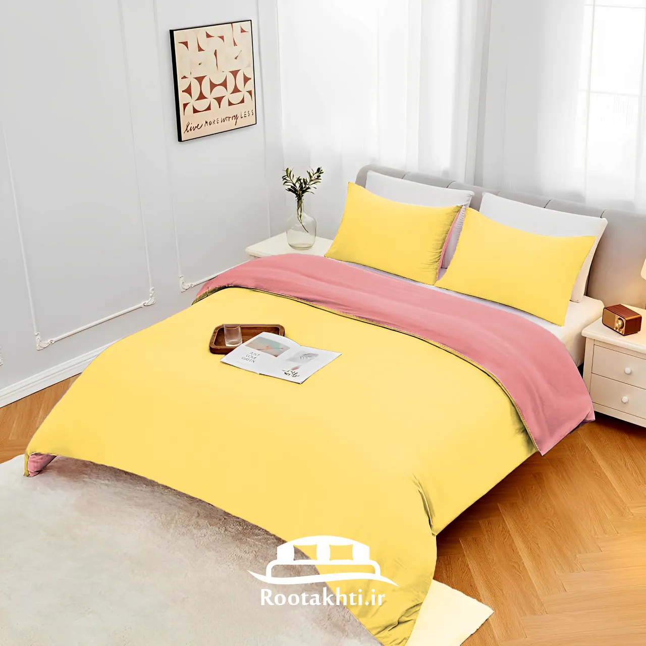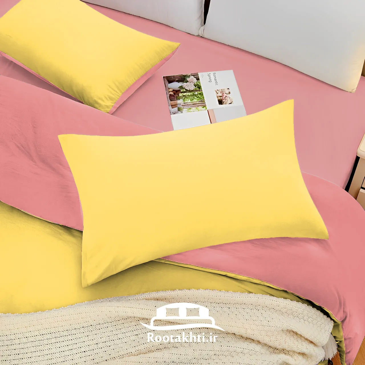 روتختی دورنگ صورتی لیمویی، ترکیبی لطیف و سرزنده است که حال‌وهوایی روشن و دلپذیر به اتاق خواب شما می‌بخشد. صورتی با حس آرامش و لطافت، فضایی صمیمی ایجاد می‌کند و لیمویی با انرژی شاد و درخشان خود، طراوت و نشاط را به فضا می‌آورد.